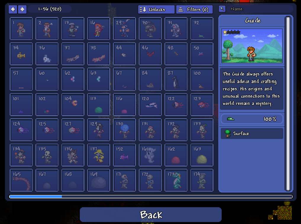 - Four unique enemies are excluded from the bestiary: Spiked Slimes, Golden Slime, Jungle Mimic and Pirate's Curses