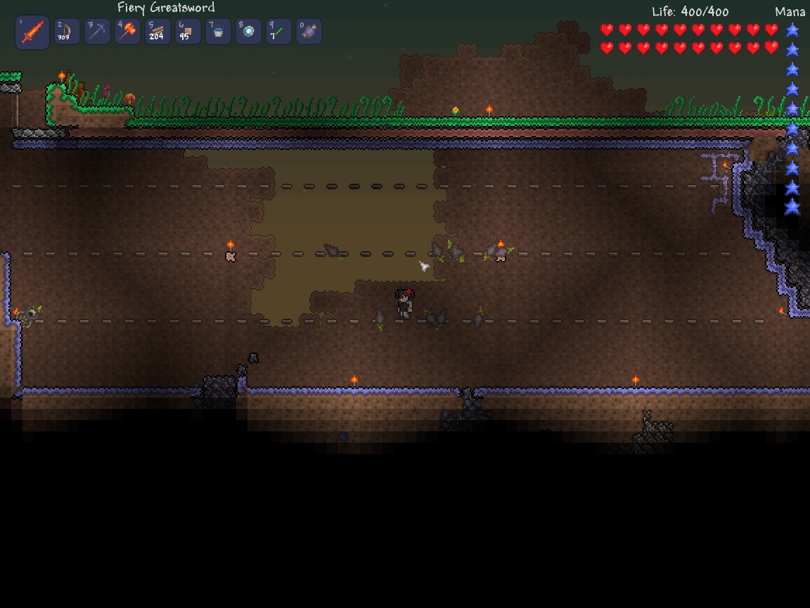 Arena This boss arena was built in the middle of a corrupted area. It was dug underground so that the Eater of Worlds could have some ground to move around in. Since this boss can only be fought in the Corruption, your arena will need to either be located in the Corruption, or be made out of enough Dirt Blocks covered with corrupted grass and/or Ebonstone Blocks (500 blocks should do the trick) for the game to determine that it lies within a valid corrupted area. The arena doesn't have to be very big (around 75 blocks is a nice width), though it should have a roughly flat surface at the bottom, and at least 2 rows of wooden platforms for avoiding the Eater of Worlds should it decide to swim along the surface of the bottom floor or one of the rows of wooden platforms. If you'd like, you can dig some holes beneath your arena (and to the sides and above it if it was built underground) to more easily spot the Eater of Worlds before it attacks. If you built your arena above ground, then you may have to deal with it becoming tangled up more often, as the boss doesn't have much earth to swim around in. However, if you built your arena partially or even fully underground, then the boss shouldn't tangle up as much, and can easily be set up for a quick kill (as mentioned before), though you will have to keep an eye on every side of your screen, as the boss can burst from the walls, or (if deep enough underground) even the ceiling. Bee MethodNote: this requires a Bee Keeper. With your Bee Keeper, get him in a good position(such as his head being above you). Then, keep swinging. The Eater of Worlds will try to charge at you, but it's segments will keep shattering along with the bees hitting the other ones, killing him in a flash. Minecart RamYou need a lot of iron for this strategy. Just 2 or more tracks (the less the better), and a minecart. Place the 2 tracks in a spot with barely anything surrounding it (works better underground) and then after summoning it, jump in the minecart and ram the eater of worlds' segments or head and reduce it's HP and segments very quickly | |