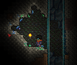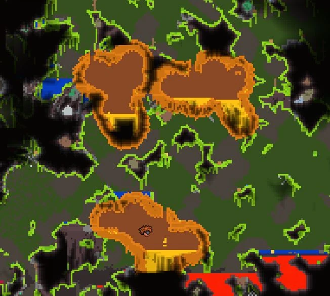 The Corruption forms during the creation of a map at a random position. In most cases there are 2 to 4 Corruptions per map. This biome has a chance to replace the Crimson entirely, making it impossible to have both of them without the Clentaminator. The Corruption spawns higher-level monsters regardless of time and thus should initially be avoided by low-level players. Shadow Orbs can be found here in deep caves called chasms. These chasms can reach all the way to the stone layer. If you happen to have Corrupt Seeds, you can create your own Corruption. Odd thorn-like bushes will grow here. Avoid these, as they will do damage.