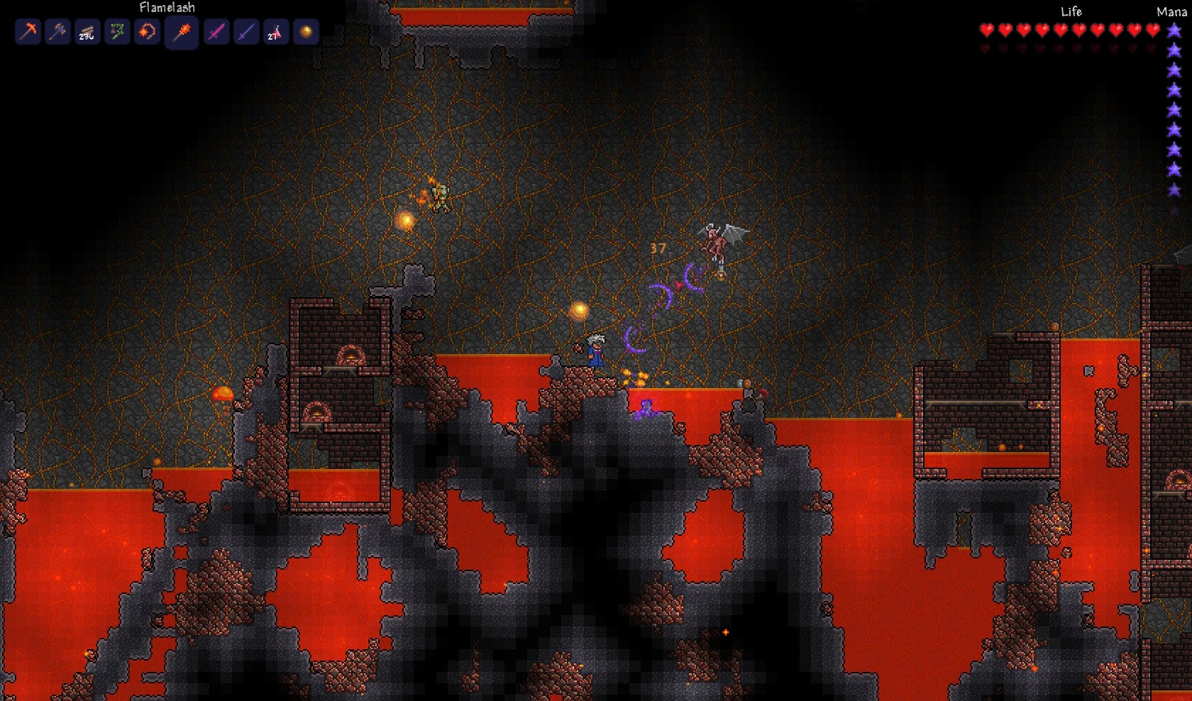 The Underworld, also known as Hell, Hades Land, or the home of the lava is a hellish realm (about 3500 Feet below on Large maps and 1700 on Small ones) that can be reached by digging past the stone layer. It is very easily identified by its background of stone with veins of Lava. It is primarily made of Hellstone ore deposits surrounded by Ash Blocks, with extensive pools of Lava. Chests with unique loot can be found here. The chests in the underworld are mainly Shadow Chests and require a Shadow Key to open. Hellstone can be used to make molten tools and armor.