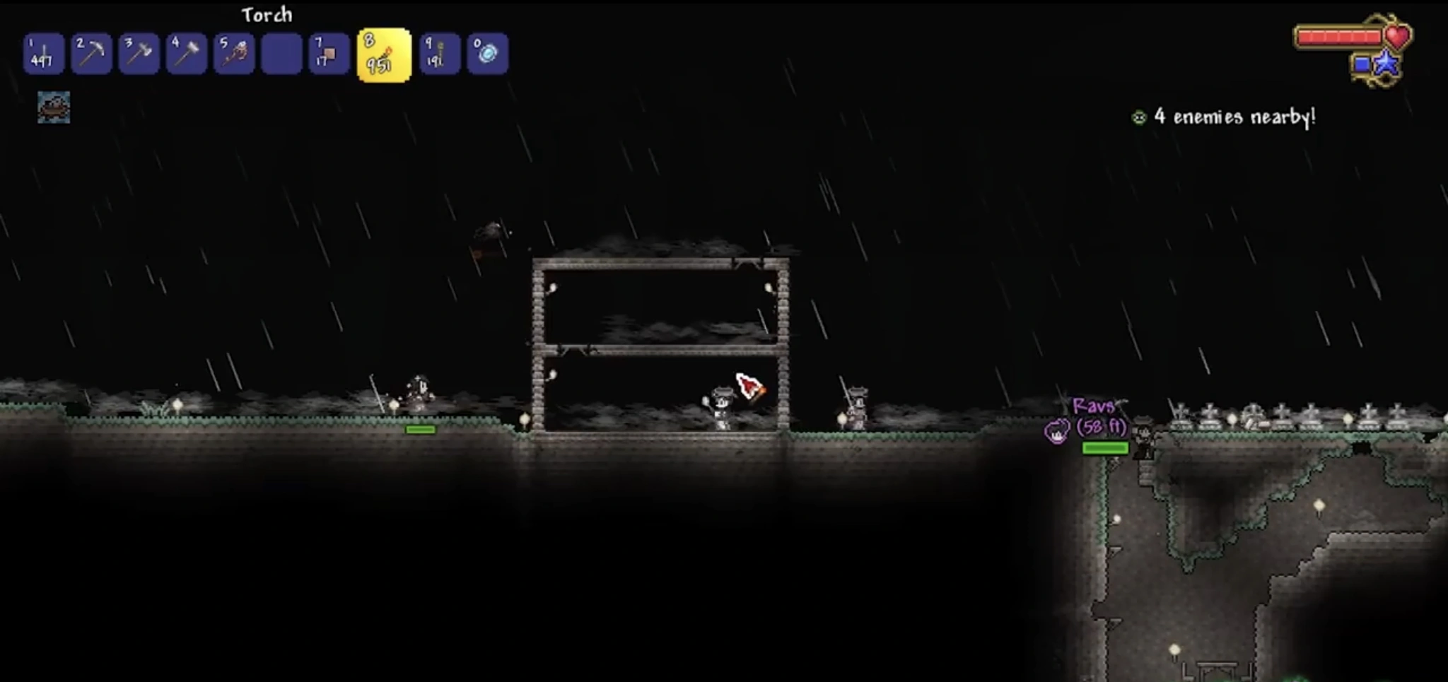 The Sword Shrine is a rare biome that can be found underground. The biome contains a rock 'shrine' inside that may or may not contain a weapon. It is a 1/3 chance to be a real weapon, and a 2/3 chance to be a fake. Usually a long hidden vertical shaft will lead to the shrine. Additionally, The real shrine has a 9/10 chance to be an Enchanted Sword, and a rare 1/10 chance to be an Arkhalis.