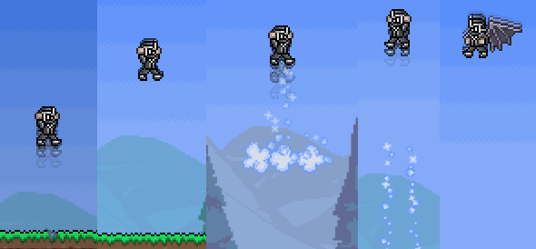 Jump height differences (from left to right): Normal, Shiny Red Balloon, Cloud in a Bottle + Shiny Red Balloon, Cloud in a Bottle + Shiny Red Balloon + Spectre Boots, Cloud in a Bottle + Shiny Red Balloon + Spectre Boots + Wings