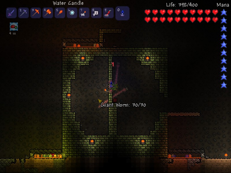 A way to farm Whoopie Cushion and other items is to reach the stone layer and mine a long tunnel from left to right, covering possible spawn areas. Place a box shape area 25x25 with dungeon bricks, build a pillar like structure in the middle, and place explosives, which are made from 3 Dynamite and 1 Wire, purchasable from the Mechanic. This will allow the worm to travel in the middle for a more precise hit with the explosives in order to hit all 7 segments and increases the drop chance. With lava pits, it can serve as a multi-purpose farm as it can farm Hooks from Skeletons, Shackles from Zombies, Gel from Black, Mother, and Baby Slimes and Bombs, Miners Pants and Shirts, which can be dropped from Undead Miners, as well as a large amount of coins. It is assumed the player has access to Dynamite, Wire, Switches, a large amount of battle potions, and a Water Candle, which can be found in The Dungeon.